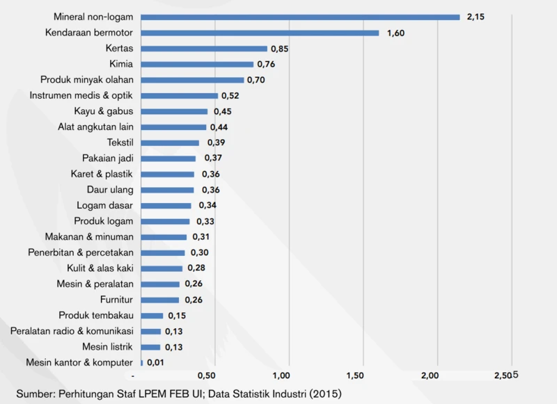 “Dari tabel terlihat bahwa 10% peningkatan harga energi akan berdampak kenaikan biaya industri, yang terbesar adalah industri mineral non-logam (bahan galian industri, bahan keramik, bahan bangunan, batu mulia),” kata peneliti LPEM UI, Mohamad Dian Revindo, Kamis (02/04).